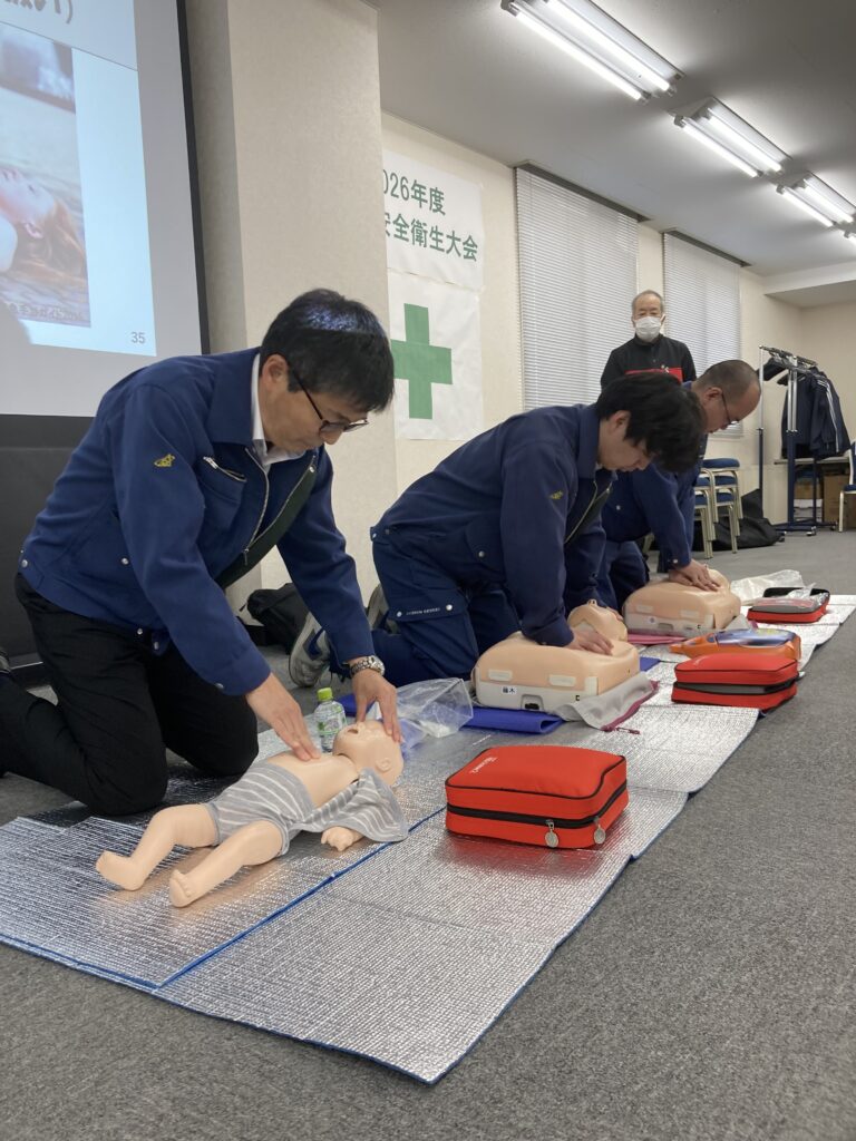 本年度は「安全は健康な体から」という考えのもと、ラジオ体操を皮切りに、実際に体を動かすプログラムを重点的に実施。札幌市防災協会様によるAED体験や、産業医・増井先生による身体機能確認ワークを通じ、自身の健康と安全への意識を深めました。