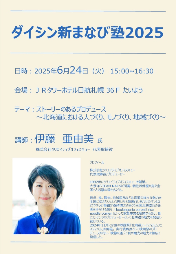 2025年6月24日にJRタワーホテル日航札幌 36F たいようで開催され、クリエイティブオフィスキュー代表取締役の伊藤亜由美様に「ストーリーのあるプロデュース ~北海道における人づくり、モノづくり、地域づくり~」というテーマでご講演いただきました。